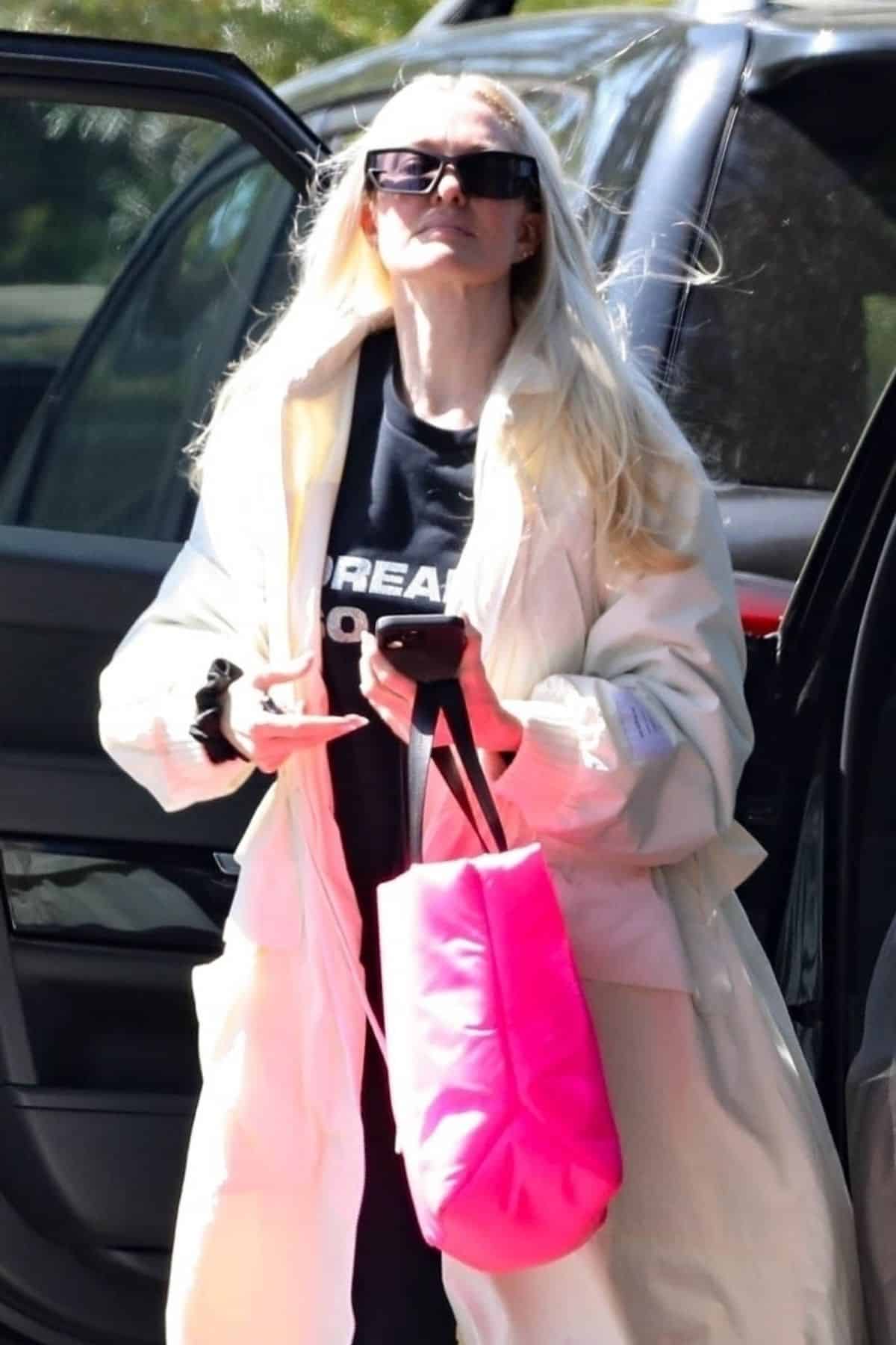 Her signature long blonde locks were blowing in the breeze and she wore a black hair scrunchie on her wrist as her other hand carried her phone and her bright pink tote bag.
